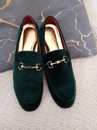Eleganti mocassini in velluto verde, perfetti per un look raffinato. - Materiale: Velluto - Dettaglio: Fibbia dorata - Interno: Fodera dorata e bordo rosso Suola cuoio e tacco in gomma.nuovi mai usati
