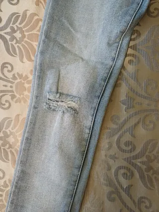Jeans a vita alta con strappi sulle ginocchia. - Vestibilità skinny. - Lavaggio chiaro. - Chiusura con zip e bottone.