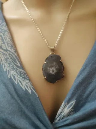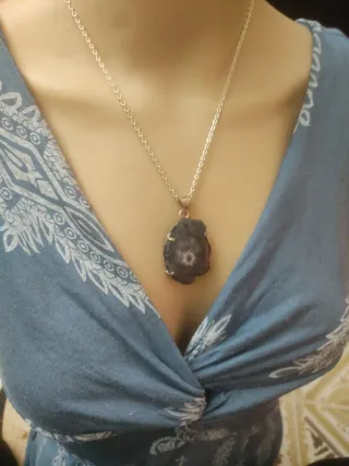 Elegante collana con pendente in quarzo solare nero e catena in argento e acciaio. - Pietra naturale con sfumature uniche. - Montatura in metallo color argento.