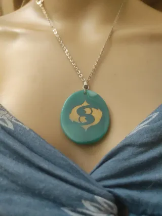 Elegante collana con ciondolo ovale in giada intarsiata con pesci dorati. La catena è in acciaio inossidabile.