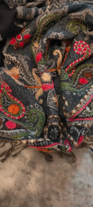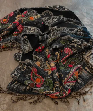 Elegante sciarpa da donna con una vivace fantasia paisley. Perfetta per aggiungere un tocco di colore e stile al tuo outfit. - Design con motivi floreali e paisley. - Bordi rifiniti con frange. - Tessuto morbido e confortevole.