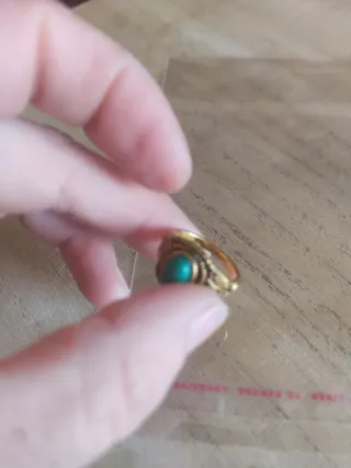 Elegante anello in ottone dorato con una pietra sintetica centrale. - Design unico con dettagli lavorati. - Pietra sintetica di colore verde brillante.