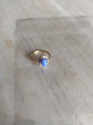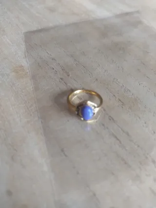 Elegante anello in ottone dorato con una pietra sintetica blu al centro. Un accessorio che aggiunge un tocco di colore. - Montatura in ottone dorato. - Pietra sintetica blu centrale.