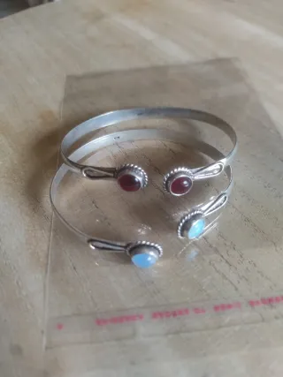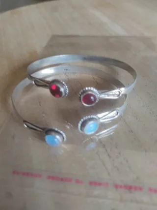 Elegante coppia di bracciali in argento 925. - Uno con pietra opale. - Uno con pietra granato. - Design aperto regolabile.