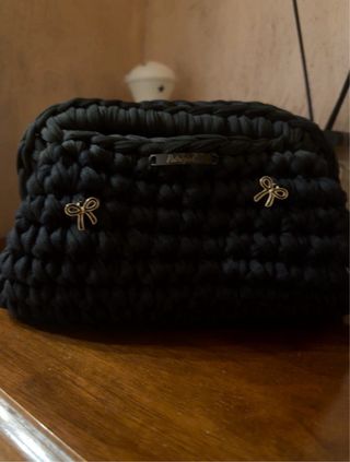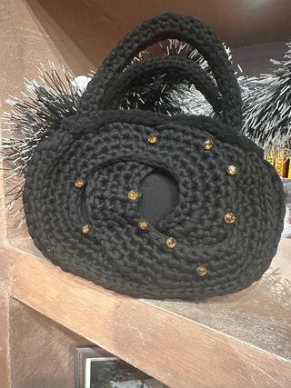 Borsa fatta a mano all'uncinetto, dal design unico e decorata con piccole perline. - Colore nero. - Manici robusti. - Decorazioni con perline color ambra.