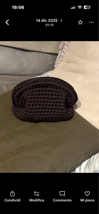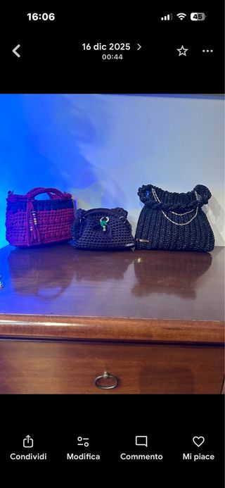 Set di tre borse realizzate all'uncinetto, perfette per aggiungere un tocco artigianale al tuo stile. - Una borsa più grande in color bordeaux con dettagli e manici. - Due borse più piccole in nero, una con catena dorata e l'altra con un charm verde. - Realizzate con cura all'uncinetto.