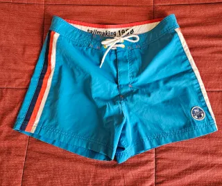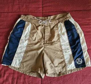 Costume da bagno pantaloncini uomo North Sails con un design a pannelli color beige blu bianco taglia 31 - Pantaloncino beige con pannelli laterali blu e bianchi. - Logo North Sails sul fondo sinistro - Tessuto leggero. - Vita elasticizzata con laccetto regolabile. - due tasche laterali - tasca posteriore con chiusura a strappo