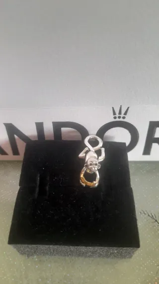 Charm Pandora a forma di scimmietta. Un gioiello unico che unisce due metalli preziosi. - Charm in argento sterling 925. - Dettagli in oro 14k. - Design a forma di scimmia con coda a spirale. Le zampe e le braccia si muovono.