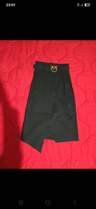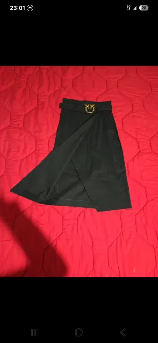 Bellissima gonna longuette nera firmata Pinko, un classico intramontabile del brand. Il capo si distingue per il design a portafoglio con taglio asimmetrico sul davanti, che dona un tocco moderno ed elegante. Iconica Cintura: Inclusa nel capo, con la celebre fibbia dorata "Love Birds" (rondini) simbolo di Pinko. Vestibilità: Vita alta che valorizza la silhouette, perfetta sia per l'ufficio che per una serata elegante. Colore: Nero intenso, facile da abbinare. Condizioni: pari al nuovo - Cintura con fibbia dorata. - Design asimmetrico con spacco.