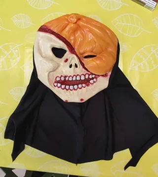 Maschera spaventosa per feste a tema o Halloween. Unisce un teschio con una zucca. - Design unico metà teschio, metà zucca. - Dettagli macabri con denti rossi e sangue. - Cappuccio nero integrato.