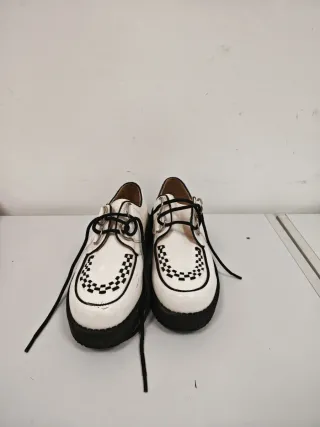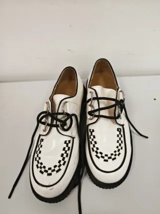Vendo scarpe stringate modello Creeper di Primadonna, numero 37. Bianche con suola platform nera e dettaglio intrecciato sulla punta. Sono scarpe super grintose e comode. ⚠️ Nota bene: Le scarpe sono usate e presentano alcuni graffi sulla punta (tutto visibile nelle foto), ma sono ancora solidissime e portabili.