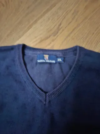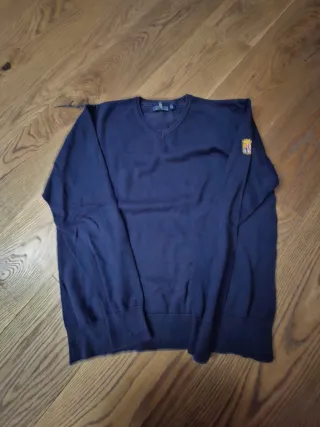 Maglioncino da uomo in tinta unita. Presenta un piccolo stemma sul braccio. - Scollo a V - Maniche lunghe - Polsini e fondo a costine