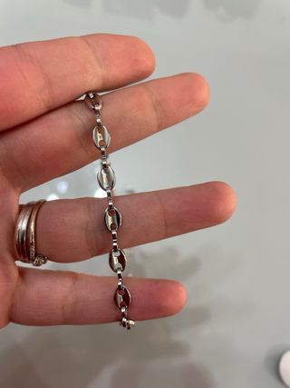 Meravigliosa collana unisex anche se personalmente direi più indicata per un uomo, ha una maglia a riportini, nota anche come maglia a piastrine o a lingottino, realizzata in argento 925. Questo tipo di maglia è composto da anelli ovoidali piatti che si alternano. Misura 46.8 cm In vendita su altre piattaforme online!