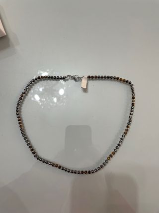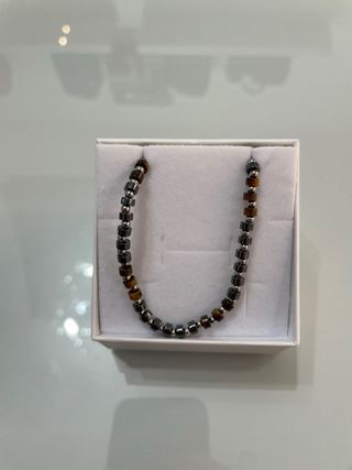 Elegante collana da uomo realizzata in acciaio con pietre color marrone e dettagli argentati. - Design moderno e versatile. - Materiali resistenti e di qualità.
