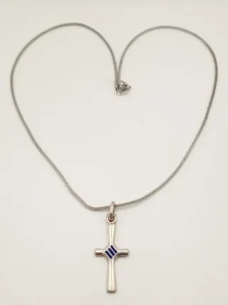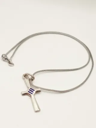 Bellissima collana con catenina a spiga e ciondolo a croce smaltata di blu, spesso è decorata con smalto a fuoco o smalto cloisonné per ottenere il colore blu intenso. Misura catenina 50.5 cm Croce Quasi 4.5 cm x 1.6 cm Il ciondolo acquistabile anche singolarmente, troverete l'inserzione nel nostro store. In vendita su altre piattaforme online!