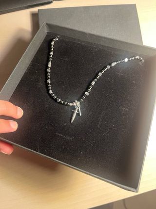 Elegante collana Marlù da uomo, un accessorio distintivo. - Design con ciondolo a forma di spada. - Perline nere e dettagli color argento. Collana Marlù da uomo con ciondolo mai usata o indossata. Colore nero. In acciaio inossidabile e fornita di scatolina e confezione originale. Collezione “Forza”. Per informazioni o foto dettagliate scrivetemi in privato.