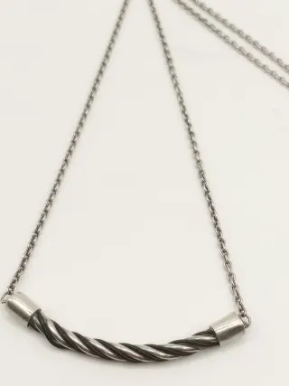 Deliziosa collana con ciondolo a barra attorcigliata, tipo fusillo, in argento 925 e caucciù, caratterizzata da un design minimalista e moderno. Design: Presenta una catena sottile che sostiene un ciondolo orizzontale a forma di barra con una lavorazione attorcigliata (o "torsionata"). I cappi terminali della barra sono cilindrici e semplici. Chiusura: La collana utilizza una classica chiusura ad anello a molla (moschettone tondo). Stile: Questo tipo di gioiello è versatile e spesso considerato unisex o da uomo, con un design semplice ed elegante che si abbina a vari look. Misura 40 cm, la barra è di 5 cm. Una molto similare ma con