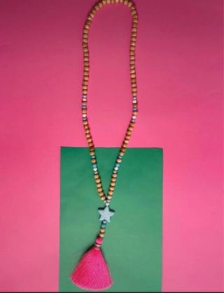 Collana con perline in legno e dettagli colorati. - Ciondolo a forma di stella turchese. - Nappa vivace color fucsia. - Perline in legno e turchese.