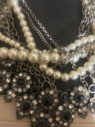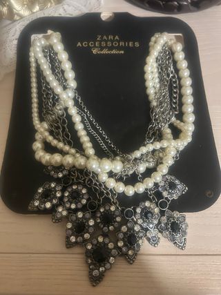 Elegante collana Zara con più fili di perle bianche e catene argentate. Il pendente è decorato con pietre scure e brillanti. - Design multistrato. - Dettagli floreali sul pendente. - Chiusura a moschettone.