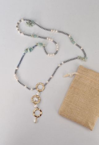 Elegante collana realizzata con perle di fiume, pietre di avventurina e sfere di ematite. Il pendente è impreziosito da anelli in ottone e perle e può anche essere rimosso - Perle di fiume bianche - Pietre di avventurina verdi - Sfere di ematite grigie - Anelli in ottone dorato