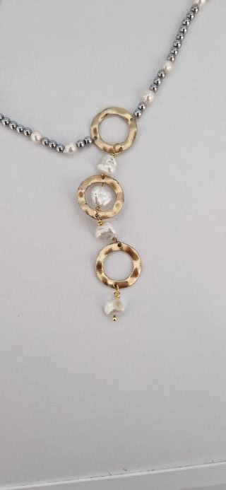 Bellissima collana composta da tre fili di perle, in tonalità oro e argento scuro. Lunghezza circa 45/46 cm. - Perle rotonde e lucide. - Chiusura con moschettone. - Perfetta per aggiungere un tocco di eleganza a qualsiasi outfit. Molto chic.