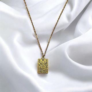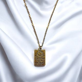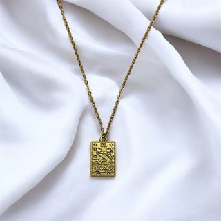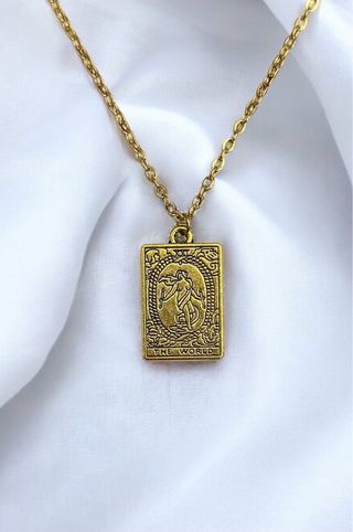 Collana con ciondolo a forma di carta dei tarocchi The World. - Ciondolo placcato oro. - Design dettagliato della carta dei tarocchi. - Catena inclusa. -Acciaio inossidabile