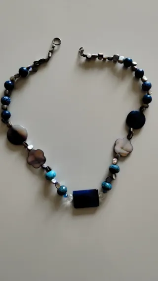 Collana di bigiotteria con un mix di perle e pietre. - Perle tonde blu scuro. - Pietre turchesi sfaccettate. - Elementi decorativi a forma di fiore e disco. - Chiusura a moschettone.