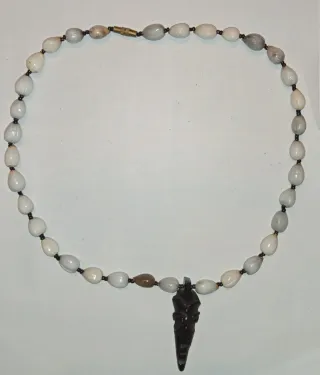 Collana etnica realizzata con semi di Job e ciondolo in legno che raffigura un viso. Lunghezza 46 cm Come foto