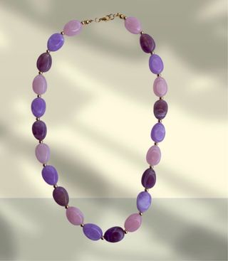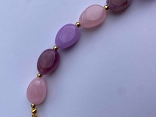 Collana realizzata a mano con perle in acrilico. Un accessorio unico che aggiunge un tocco di colore. - Perle ovali in diverse tonalità di rosa e viola. - Chiusura a moschettone dorata.