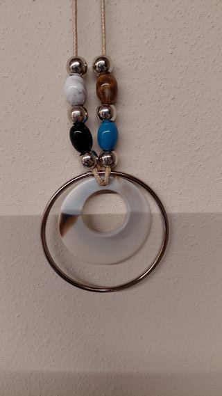 Collana artigianale dal design vintage, con un ciondolo a cerchi sovrapposti e perline colorate. - Ciondolo a doppio cerchio. - Perline decorative in varie tonalità. Lunghezza 50cm. Diametro Ciondolo 6,5 cm. Come nuova, usata ma ben corservata. Senza rotture e/o sbeccature. Visionabile e pronto ad inviare ulteriori foto su richiesta. Prezzo € 8,00. Pagamento e spedizione tramite Wallapop oppure consegna diretta in zona Cremona Città.
