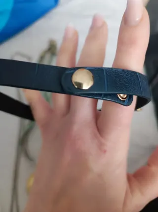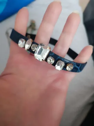 Elegante collana girocollo con un design accattivante. - Base in ecopelle blu. - Decorata con strass luminosi. - Dettagli in metallo color argento.
