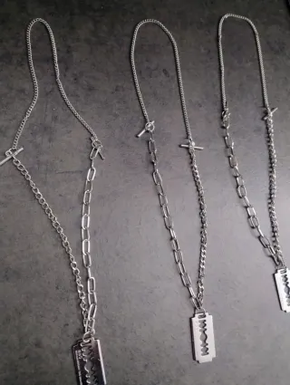 Set di tre collane con un design unico. - Ciondolo a forma di lametta. - Catena in metallo resistente. - Chiusura a T.