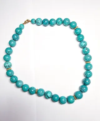Elegante collana a girocollo composta da sfere color turchese intenso con venature scure naturali (effetto pietra/howlite). Un pezzo perfetto per dare un tocco di colore sia a un outfit estivo che a un look invernale più sobrio. Dettagli: Grani tondi lisci alternati a piccoli distanziatori lavorati color oro Lunghezza 50 cm circa Chiusura: Moschettone classico dorato, robusto e funzionale. Stile: Boho, etnico, mediterraneo.
