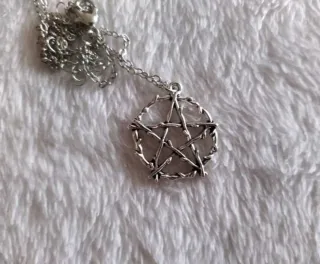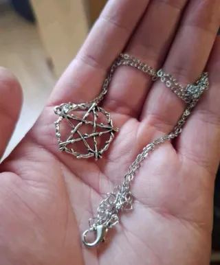 Collana con ciondolo a forma di pentacolo realizzato con rami intrecciati. - Design unico e dettagliato. - Stile ispirato alla Wicca. - Finitura argentata.