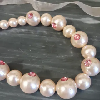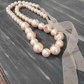 Elegante collana con perle sfumate e dettagli luminosi in strass in tinta. - Perle di diverse dimensioni da 1,5 a 2,5 cm. - Inserti di strass rosa. - Chiusura con nastro in organza. - Lunghezza minima cm.78, massima oltre 120. - La chiusura a nastro permette di indossare la collana facendo un doppio giro. - Due perle non sono perfette ed uno dei nastri è leggermente sfilacciato come da foto.