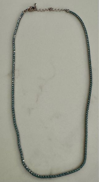 Splendida collana tipo tennis necklace o punto luce per un tocco di eleganza scintillante! Colore: Strass color azzurro cielo/celeste chiaro (perfetta per un look fresco o una serata speciale). Design: Presenta una fila singola di strass luminosi incastonati che riflettono la luce splendidamente. La chiusura è dotata di una catenella di regolazione (estensore), che permette di adattare perfettamente la lunghezza al tuo collo (come un girocollo o leggermente più lunga). Non ho la scatola originale. Verrà spedita ben protetta. Difetti:la collana ha piccoli segni di usura come mostrato in foto ma non compromette l’estetica. Prezzo:3,99
