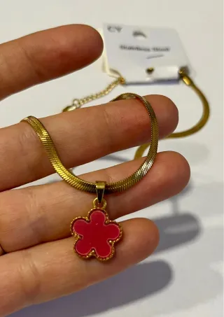 Collana in acciaio con un ciondolo a forma di fiore rosso smaltato stile Van Cleef, lunghezza 42 cm. - Ciondolo smaltato rosso con bordo dorato. - Catena sottile in maglia snake dorata. - Chiusura a moschettone.