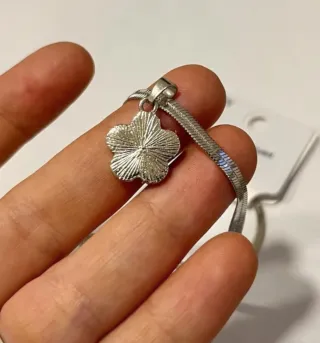 Elegante collana con un ciondolo unico. Il design è moderno e raffinato. Mai indossata - Ciondolo con pietra centrale bianca. - Dettagli in metallo color argento. - Catena sottile e resistente.