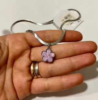 Delicata collana a maglia snake con pendente a forma di fiore stile Van Cleef. Lunghezza 42 cm. Chiusura a moschettone. - Materiale: acciaio argentato. - Pendente: fiore smaltato color lilla.