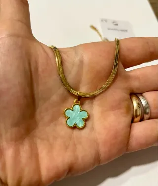 Delicata collana con catena in acciaio argentato e un ciondolo a forma di fiore color menta. Un accessorio semplice ma d'effetto. Stile Van Cleef, lunghezza 42 cm. - Materiale ciondolo: metallo smaltato - Chiusura moschettone