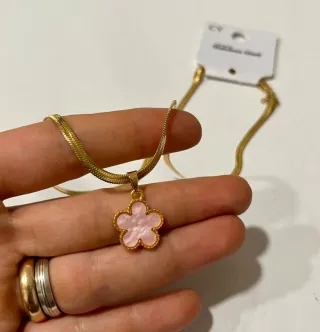Delicata collana in acciaio maglia snake con finitura dorata e un ciondolo a forma di fiore stile Van Cleef. Lunghezza 42 cm. - Ciondolo smaltato rosa. - Catena a maglie piatte.