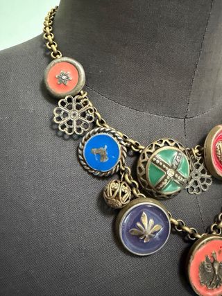 Collana vintage in bronzo con dettagli in smalto colorato, risalente agli anni '70. - Design unico con ciondoli a tema. - Chiusura a moschettone. - Lunghezza regolabile, massima cm 43 #70s #collanavinyage #collanabronzosmalto #collanasmaltata #statementenecklace #chooker