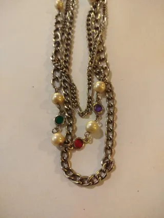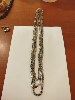 Collana lunga in stile vintage, un accessorio che aggiunge un tocco di colore. - Catena color argento. - Perline colorate alternate a perle. - Design multistrato.