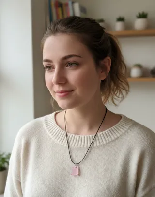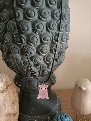 Deliziosa collana con un ciondolo a forma di maialino. - Ciondolo in resina rosa. - Cordino nero regolabile.
