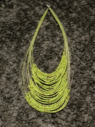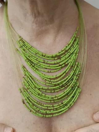 Collier con molti fili di perline verdi ed oro