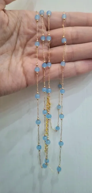Collana lunga dorata con perline azzurre