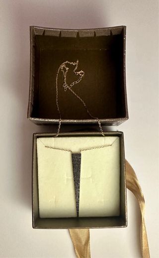 Elegante collana in argento con un pendente a forma di punta realizzato con cristalli Swarovski neri. - Lunghezza catena regolabile. - Chiusura a moschettone. - Design moderno e raffinato.