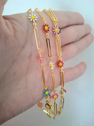 Deliziosa collana con pendenti a forma di fiorellini colorati e dettagli dorati. - Fiori smaltati in diverse tonalità. - Elementi a forma di barretta dorata. - Catena sottile e luminosa.