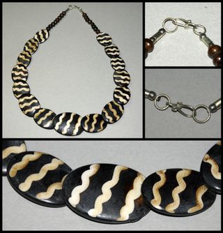 Collana etnica con un design unico e accattivante. - Inserti ovali con motivo a onde intarsiato beige su fondo nero.