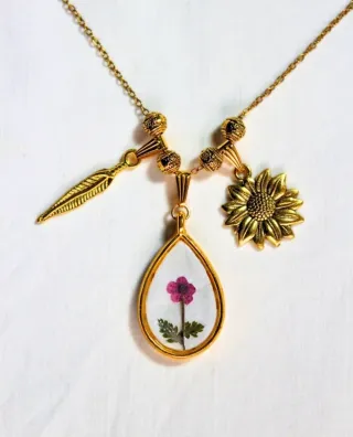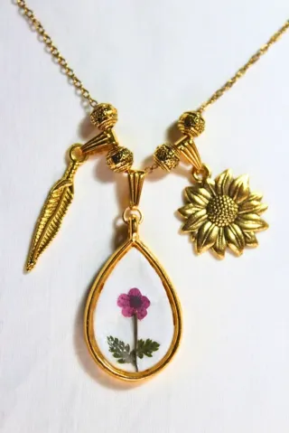 Deliziosa collana con pendente a goccia contenente un fiore pressato e foglioline. La catena è impreziosita da elementi decorativi dorati e da due ciondoli a forma di piuma e girasole. - Ciondolo centrale con fiore vero pressato. - Ciondolo a forma di piuma. - Ciondolo a forma di girasole.